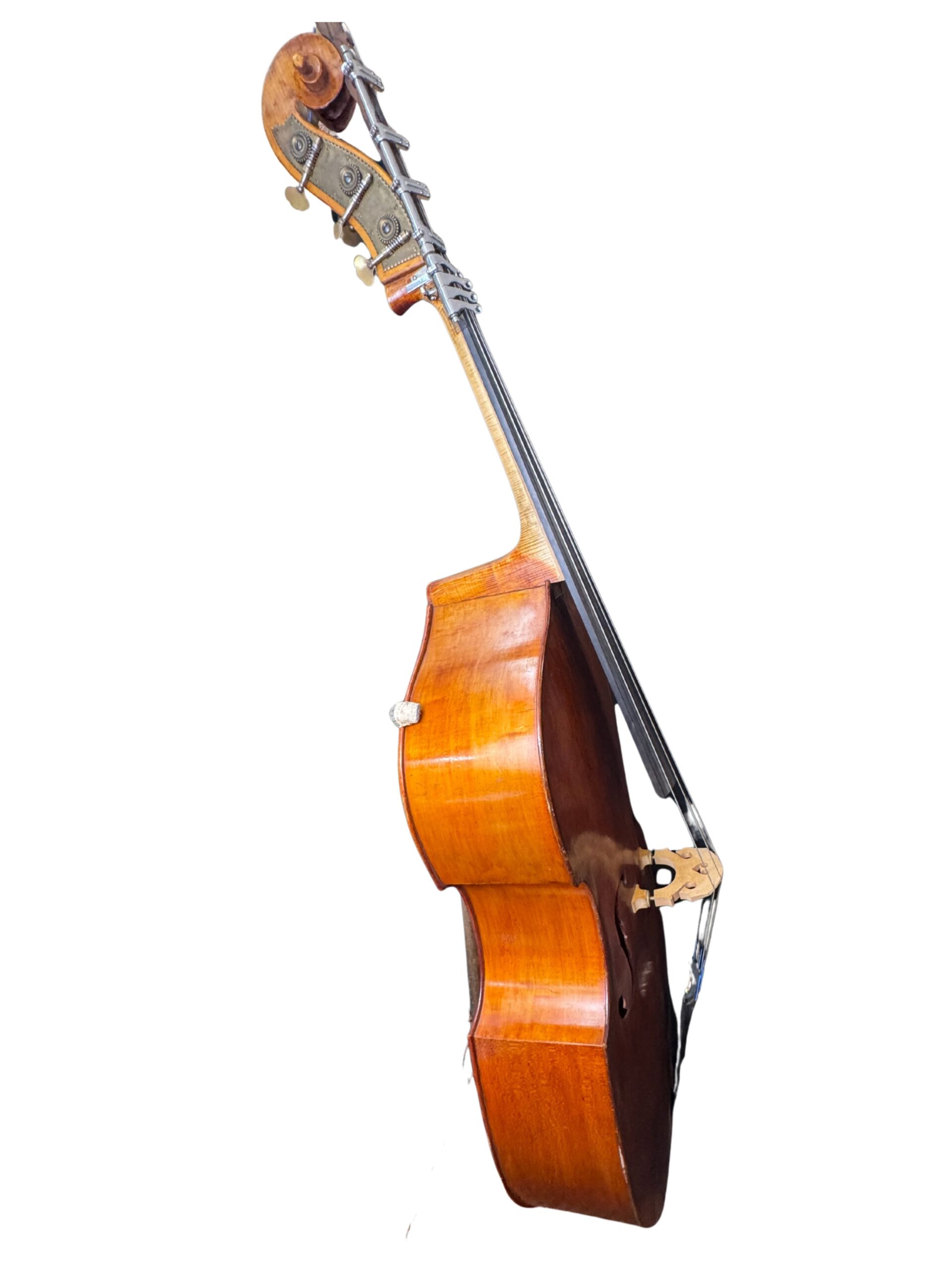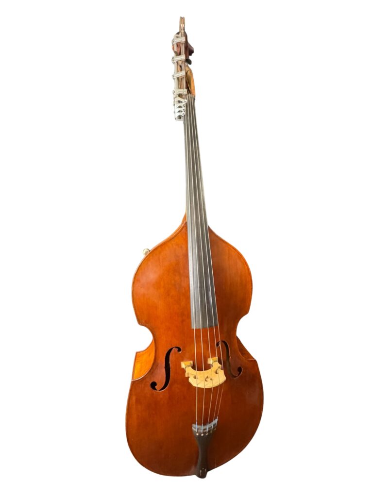 This bass is a true five-string (B-E-A-D-G) instrument, but its most unique feature is a custom-made “Low G Extension” built onto the low B-string. This is an extremely rare, specialized mechanism that allows the player to reach notes below the standard low B, all the way down to a G0. This modification provides an unparalleled tonal range for the most demanding orchestral repertoire.